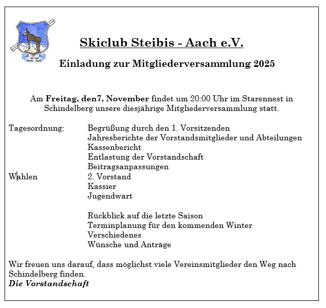 Unser Skiausflug nach Warth findet am Samstag den 13. Dezember 2025 statt. Details werden zeitnah hier bekannt geegeben.